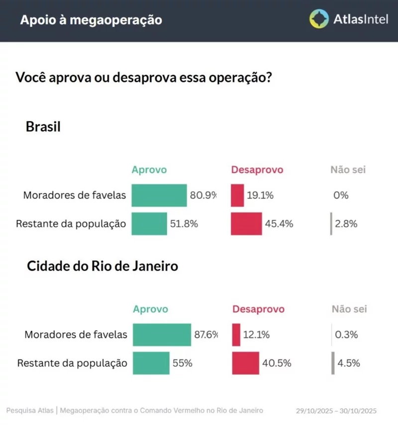 Pesquisa AtlasIntel apontou que 88% dos moradores de favelas da capital do Rio de Janeiro apoiam a megaoperação policial realizada nesta terça-feira (28) nos complexos da Penha e do Alemão.