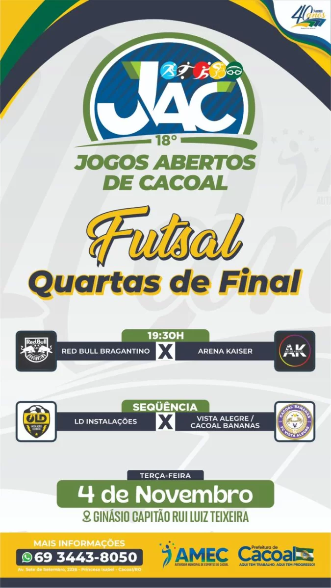 A cidade de Cacoal se prepara para mais uma noite de grandes emoções com as quartas de final do futsal dos 18º Jogos Abertos de Cacoal (JAC), que acontecem nesta terça-feira (4 de novembro), no Ginásio Capitão Rui Luiz Teixeira. O evento reúne atletas de diferentes bairros e comunidades, reforçando o papel do esporte como instrumento de integração e valorização social.