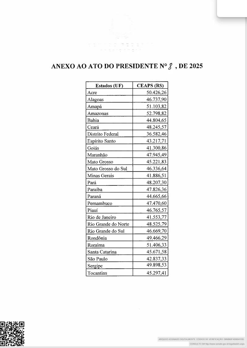 Os novos valores variam conforme o estado de origem dos senadores. Os parlamentares do Distrito Federal terão direito a R$ 36,5 mil, enquanto os do Amazonas concederam até R$ 52,7 mil para cobrir despesas como passagens aéreas e propaganda. Além desse aumento, Alcolumbre também autorizou outros benefícios para os servidores do Senado, incluindo um reajuste de 22% no auxílio-alimentação e a concessão de uma folga a cada três dias de trabalho para i.