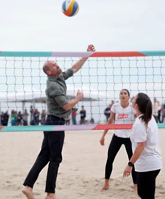 No momento, o herdeiro do trono aproveitou para mostrar suas habilidades na areia. Junto a atleta e aos jovens do instituto, William jogou uma partida de vôlei de praia.