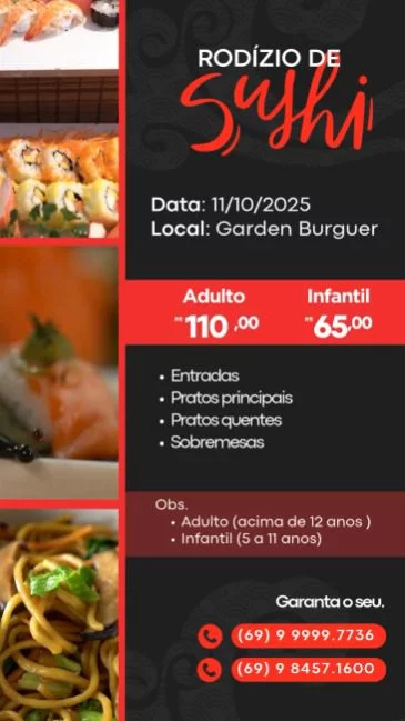 Os amantes da culinária japonesa têm um encontro marcado em Pimenta Bueno neste sábado, dia 11 de outubro, com a realização do 1º Rodízio de Sushi da cidade. O evento acontece no Garden Burguer e promete uma experiência gastronômica completa, repleta de sabores orientais e um cardápio variado preparado com todo o cuidado pela equipe da Senshi – Comida Japonesa.