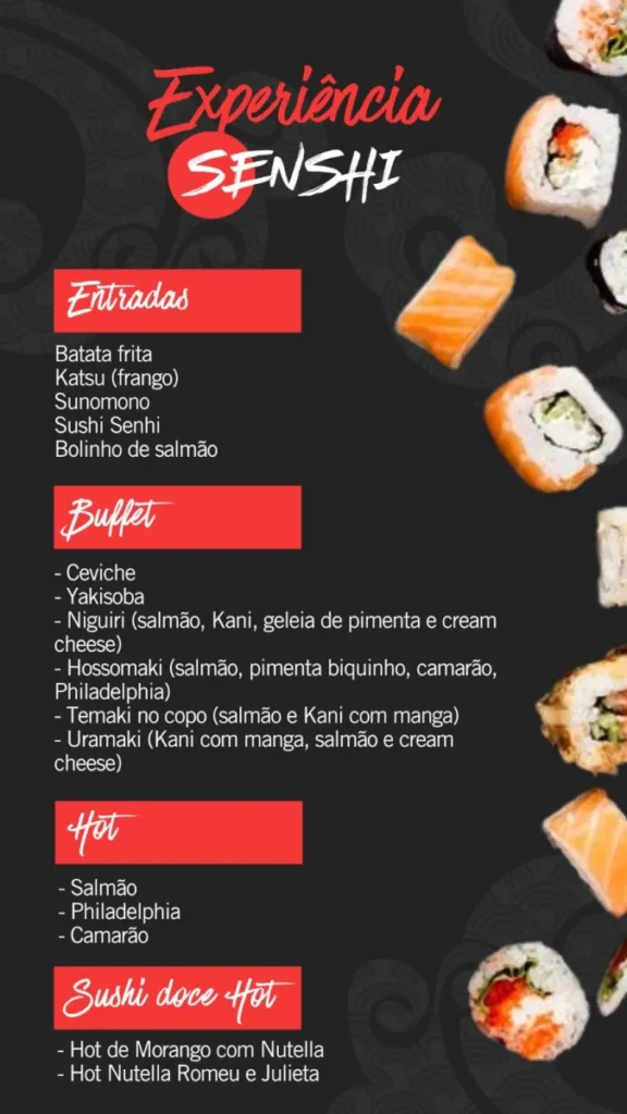 Com o tema “Experiência Senshi”, o rodízio oferecerá uma seleção especial de entradas, pratos principais, opções quentes e sobremesas, incluindo delícias como sushi Senhi, ceviche, yakisoba, temaki, niguiri, hossomaki, uramaki e os famosos sushis doces hot, entre eles o irresistível Hot de Morango com Nutella e o Hot Nutella Romeu e Julieta.