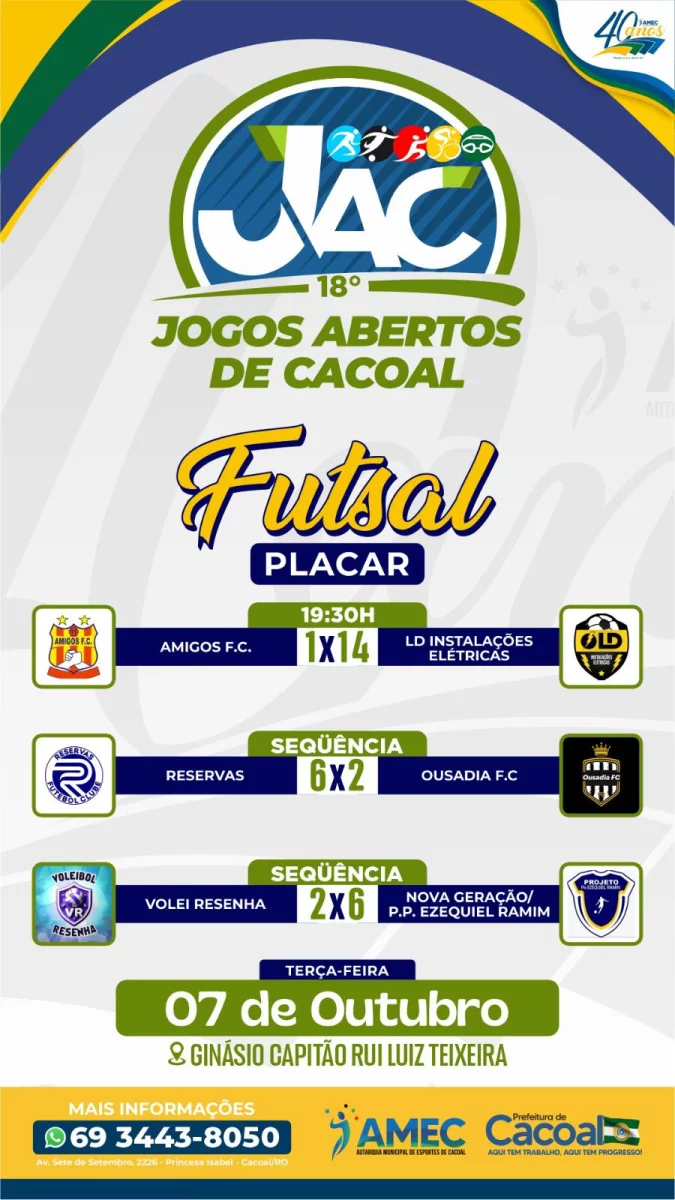 O Ginásio Capitão Rui Luiz Teixeira foi novamente palco de grandes emoções nesta terça-feira (7), durante mais uma rodada dos 18º Jogos Abertos de Cacoal (JAC). Com três partidas de futsal movimentando a noite, o público presente acompanhou confrontos intensos, muitos gols e atuações que reforçam o alto nível técnico da competição.