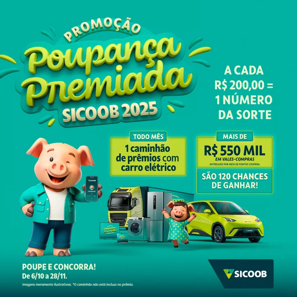 Serão sorteados, mensalmente, um caminhão de prêmios com um kit completo para casa nova, incluindo eletrodomésticos, eletrônicos e itens de uso doméstico, além de um carro elétrico. Paralelamente, o Coopera, marketplace e shopping virtual do Sicoob, sorteará 120 poupadores que receberão mais de R$ 550 mil em vale-compras, que serão divididos entre os sorteados. A campanha é válida até 28 de novembro, com sorteios baseados nos resultados da Loteria Federal.
