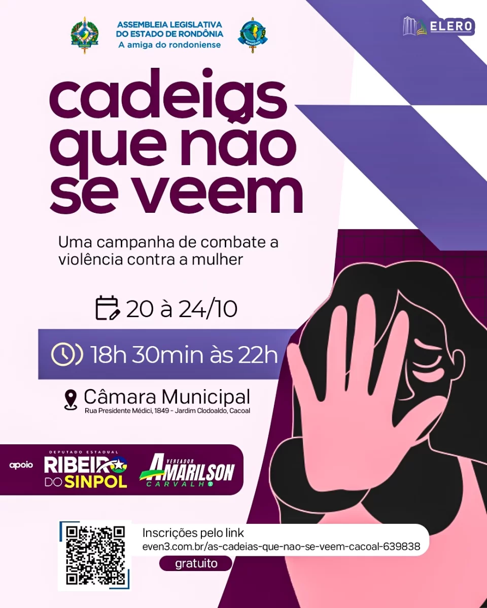A Escola do Legislativo de Rondônia (ELERO) realiza, entre os dias 20 e 24 de outubro, a campanha “Cadeias que não se veem”, uma importante ação de combate à violência contra a mulher. O evento acontecerá na Câmara Municipal de Cacoal, das 18h30 às 22h, reunindo palestras, debates e atividades voltadas à conscientização e ao fortalecimento feminino.