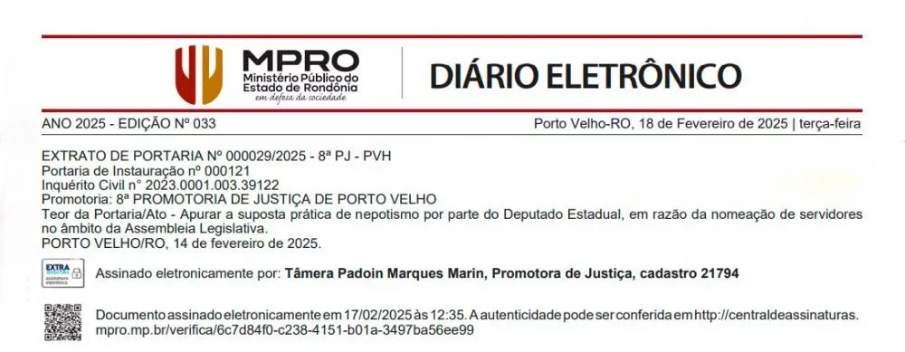 Publicado no Diário Oficial desta terça-feira (18), o Diário Oficial do MPRO, através de portaria nº000029/2025, a 8ª Promotoria de Justiça de Porto Velho, instaurou inquérito civil nº 2023.0001.003.39122, para apurar o parlamentar.