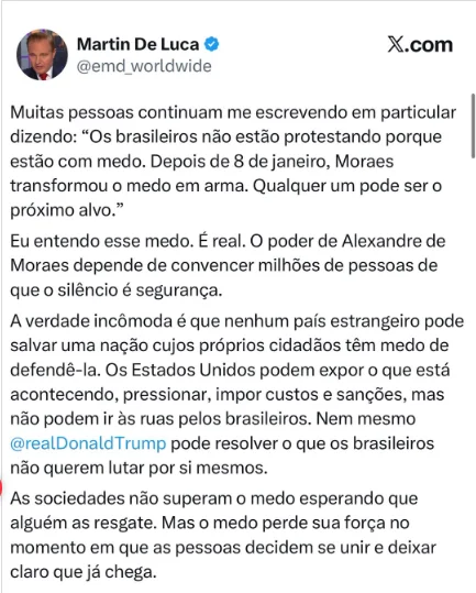 De Luca escreve que entende o temor mencionado e afirma que o poder atribuído ao ministro se sustenta na ideia de que “silêncio significa segurança”. Segundo ele, nenhum país estrangeiro pode “salvar uma nação cujos próprios cidadãos têm medo de defendê-la”, destacando que os Estados Unidos podem denunciar eventos, impor pressões e sanções, mas não podem ocupar as ruas em nome dos brasileiros.