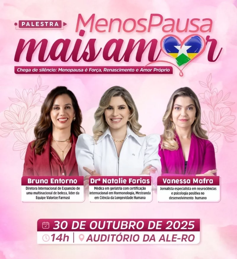 Em alusão ao Outubro Rosa, a Assembleia Legislativa de Rondônia (Alero) sediará, no dia 30 de outubro, a palestra “MenosPausa MaisAmor – Chega de silêncio: Menopausa é força, renascimento e amor próprio”. O evento é uma iniciativa do deputado estadual Marcelo Cruz (PRTB) em parceria com o vereador Pastor Evanildo e tem como propósito fortalecer as ações de conscientização sobre a saúde da mulher, com foco no câncer de mama, na menopausa e na reposição hormonal.
