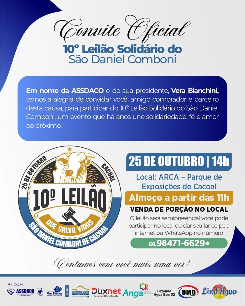 Neste sábado, dia 25 de outubro, a partir das 14h, acontece o 10º Leilão Solidário São Daniel Comboni, no Parque de Exposições da Associação Rural de Cacoal (ARCA). O evento é uma realização da ASSDACO – Associação Assistencial à Saúde São Daniel Comboni, com o apoio de parceiros, e tem como objetivo arrecadar recursos em prol do Centro de Imagens São Daniel Comboni, que está sendo construído no município para facilitar a realização de exames de diagnóstico para o câncer.