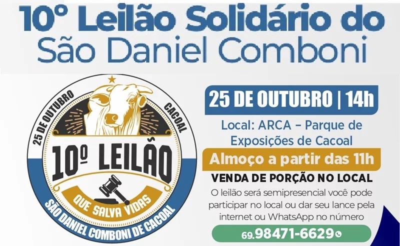 Neste sábado, dia 25 de outubro, a partir das 14h, acontece o 10º Leilão Solidário São Daniel Comboni, no Parque de Exposições da Associação Rural de Cacoal (ARCA). O evento é uma realização da ASSDACO – Associação Assistencial à Saúde São Daniel Comboni, com o apoio de parceiros, e tem como objetivo arrecadar recursos em prol do Centro de Imagens São Daniel Comboni, que está sendo construído no município para facilitar a realização de exames de diagnóstico para o câncer.