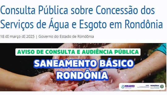 O Governo de Rondônia realizará uma Consulta Pública no dia 04 de abril para debater a concessão dos serviços de abastecimento de água e esgotamento sanitário em diversos municípios do estado. O prefeito de Cacoal, Adailton Fúria, já manifestou firme oposição à inclusão do Serviço Autônomo de Água e Esgoto (SAAE) no processo, garantindo que a companhia municipal não integrará a lista de concessões.