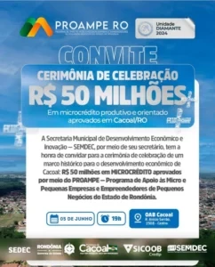 A Secretaria Municipal de Desenvolvimento Econômico e Inovação de Cacoal (SEMDEC) realizará, no dia 5 de junho, às 19h, uma cerimônia histórica para o desenvolvimento econômico local: a celebração da marca de R$ 50 milhões em microcrédito produtivo e orientado aprovados por meio do PROAMPE – Programa de Apoio às Micro e Pequenas Empresas e Empreendedores de Pequenos Negócios do Estado de Rondônia.