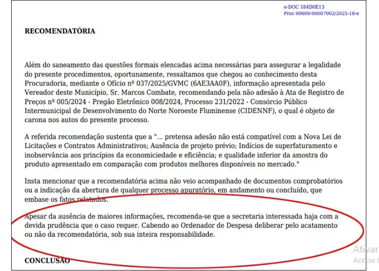 Na época, o procurador Felippe Idak recomentou “que a secretaria interessada haja com a devida prudência que o caso requer, cabendo ao ordenador de despesa liberar pelo acatamento ou não da recomendatória, sob sua inteira responsabilidade”. A procuradoria não proibiu a compra, mas pediu ao gestor esclarecimentos no processo sobre os requisitos da Lei de Licitações, inclusive da “vantajosidade econômica”.