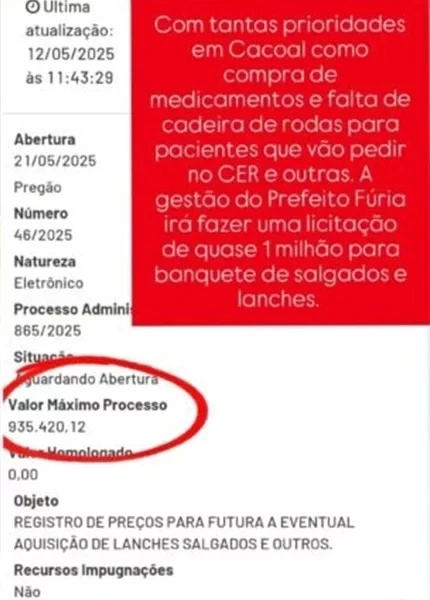 O processo também queria adquirir outros quitutes como bolos e lanches. E não deu outra nas redes sociais: “Com tantas prioridades em Cacoal como compra de medicamentos e falta de cadeiras de rodas para pacientes que vão pedir no CER e outras, a gestão do prefeito Fúria irá fazer uma licitação de quase 1 milhão para banquete de salgados e lanches”, apontou uma postagem.