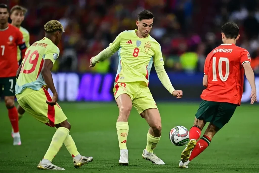 Foi aos 20 minutos que a Espanha abriu o placar na grande decisão. Lamine Yamal alçou bola dentro da área. Ruben Dias cortou mal e a bola sobrou na pequena área. O goleiro Diogo Costa saiu do gol para ficar com ela, mas antes João Neves tentou afastar. O português entregou nos pés de Zubimendi, que completou para o fundo das redes.